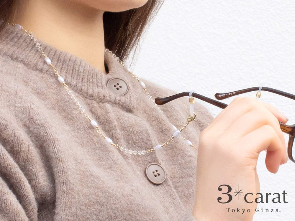 メガネを掛けたままでも、首から下げたり、片方を外して首からぶら下げたりできるので、便利でありながらスタイリッシュなアイテムです。