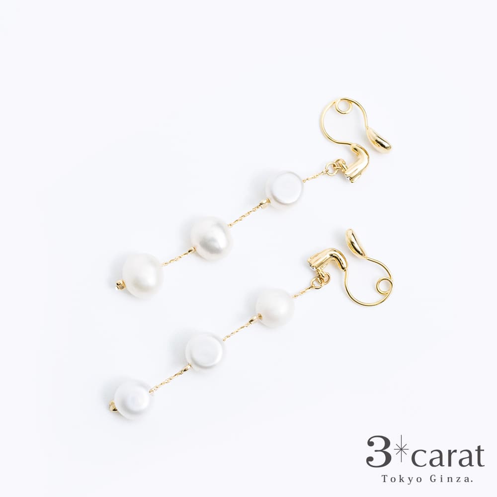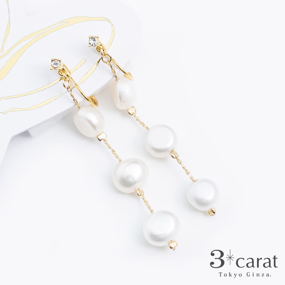 3粒の連なる淡水パールが優しく揺れるエレガントなデザイン。