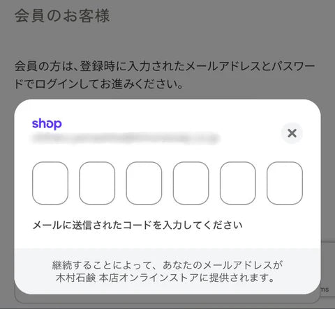 ご登録のメールアドレスと携帯電話番号宛てに、ShopPayより6桁のコードが送信されますので、ダイアログにコードをご入力いただくとログインできます。